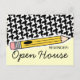Ett vykort med en framsida som består av houndstav och en gult penna. Texten lyder "REMINDER: Open House". Anpassa baksidan med information om din händelse.