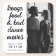 Bröllop spara datum underlägg, perfekt som ett unikt tillfälle att spara datumet för ert kommande bröllop. Lustigt textformat med texten "Sprit, mat och dåliga dansrörelser" Anpassa med ditt bröllop-datum, namn och foto.