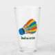 Badminton Design Drinking Glass with customizable text and background color.
