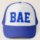 Kunglig blått- och vittruckerkeps med utskrivaven BAE i blåttbokstäver.