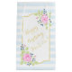 Bag för eget namn för blåbär i grattis på födelsedagen Finare Ro. Ro, grönt löv och blåbär på blått rand, anpassadets önskan i guld och namn (guld är inte guld utan färg). Finare, feminin, glatt och ornat, med något viktoriskt utseende och känsla. Rosa, blå, djup lila, grönt.