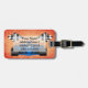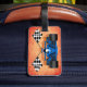 Stativ ut i bagagekarusellen med en bagagemärkre för tävlings- bil, som presenterar en brännhet orange lutningbakgrund, en blåtttävlingbil med flammar kommande av däcken, svartvit rutig tävla sjunker. Text är ställer in för ditt namn, adressen och telefonnummer eller någon text som du önskar. Perfekt gåva för raceren i ditt liv. Läderbagage fäster inklusive.
