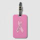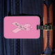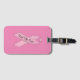 Rosa bagaget designat för bröstcancermedvetandemånaden, oktober, informationskortet "Hitta boklen" på det bakre infallsbagaget slutar i borttappad och hittas.