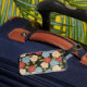 Bagagetagg med blues, pinkar, grönt och guld bagagebricka
