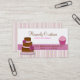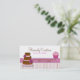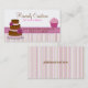 Nätt bagerivisitkort som göras med grafiskt konstverk av en nyckfull rosa, brunt och vit görat randig mönster, på grunden och baksidaen av kortet. En rosa muffin- och lagrartårta för tecknad dekorerar bekläda av kortet. Personifiera texten för din bageriaffär. Underbar för hemmastadda bagare för. En litet olik version är tillgänglig med färger för en tadtändare, ser för att anknyta nedanfört.