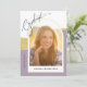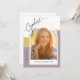 Denna eleganta inbjudan till examenfest har ett bågformat foto på framsidan och ett andra på baksidan. Designen är accentuerad med färgen dammig lila och en falsk texturerad guld färg. Ordet "examen" visas i ett modernt skrivstil. Anpassad text på baksidan låter dig lägga till detaljer om din festinbjudan.