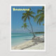 Det här postkortet innehåller ett foto av högt handflatan träd som lutar över den klara blå vatten och vita sanden av en bhamansk ut-ö. Paradise i bild.
