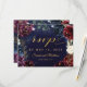 En samling djupa burgundröd, lila- och marinblå peonier med skuggande guld-accenter och konturer mot en mörk rik marinblå vattenfärgsduk med fläckar av guld anger tonen för denna lavish bröllopsinbjudan. I ett livligt skript i guld meddelas dina uppgifter och inbjudningskort dina gäster till bröllop.