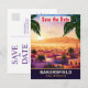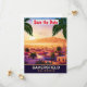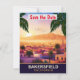 Bakersfield, spara datum bröllopsinbjudan, resekort. Vacker solnedgång över stadens siluett och berget bakom.