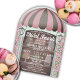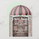Rosa Inbjudningskort för möhippan med parisiskt bageritema. Information om evenemanget ges som en skylt till en fönsterbutik på framsidan av en Fransk Parisian Patisserie of Café. Var snäll och anpassa texten!