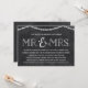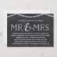 Denna vackra, rustika bröllopsdagsinbjudan har "Herr & Fru" skrivet i gammaldags typografi, en lysande kedja av hjärtformade lampor och en svart tavla som bakgrund.