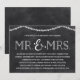 Denna vackra, rustika bröllopsdagsinbjudan har "Herr & Fru" skrivet i vintage-typografi, en lysande sträng hjärtformade lampor och en svart tavla-bakgrund.