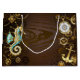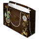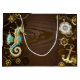Brunt träbakgrund med havs-, mekanisk åda, antika rattar, gyllene ankare och olika guld- och brassväxlar. Steampunk stil.