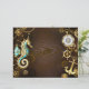 Brunt träbakgrund med havs-, mekanisk åda, antika rattar, gyllene ankare och olika guld- och brassväxlar. Steampunk stil.
