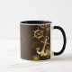 Brunt träbakgrund med havs-, mekanisk åda, antika rattar, gyllene ankare och olika guld- och brassväxlar. Steampunk stil.