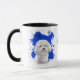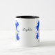 Ett vackert porträtt vatten färg i en vacker vit bichon Frise står ut mot en ljusblå abstrakt stänk stänk. Bilden finns på två sidor av mugg, med ditt namn eller annan anpassningsbar i svart mellan dem.