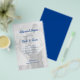 Motiveringsmall för inbjudan till bröllop-repetitionsmiddagsfoto. Tungt blå text över ett foto av bruden och brudgummen i bakgrunden. Made för en repetitionsmiddag, men ändra ordalydelsen för varje tillfälle, t.ex. en möhippa eller förlovningsfest, och spara med hjälp av flygblad pappert. Endast för detta storlek. Omvänd är också marinblå färg.