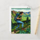 Ett vykort till behållan vid beröring medan du håller på att leta upp spåret. En kvinna med ryggsäck som stukar A.T. eller en av vandringarna genom bergen och skogen. Ai-konst gjord i tecknad bok pop art stil.