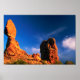 Balanserad sten vid solnedgången, Arches National Park, Utah. Balanserat sten är en av de mest välkända sten-formationerna i Förenade Stater. Erosion och självsvårighet kommer en dag att ta sitt pris på denna fantastiska formation och lämna den inte tittar mer imponerande än den komplementär som illustreras här. Du kommer åtminstone att ha den här bilden för att påminna dig om hur vacker den var. Men bara om du lägger till den i din vagn. Njut av vyn.