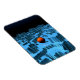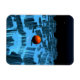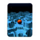 Digital grafik med tredimensionell röd sfärisk balansering kant i ett geometriskt blått bergslandskap.