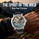 This circular watch features a majestic bald eagle with outstretched wings, soaring above a stormy ocean and clutching a fish in its talons. The background shows rugged mountains and a sun-drenched sky. The watch face is bordered by a black and white triangular pattern, giving it a strong, natural, and wild aesthetic.