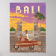 Vintage stil reseaffisch på Bali. Sol går ner, En äventyrlig flicka på en skotcykel med ytor på den som kör längs vägen framför Kuta-Legian-stranden med dess traditionella Balinese grind. Originalillustration av Vectro Poster Co av Nasir Udin.