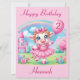 En vacker balerina-ko firar sin födelsedag klädd i en rosa klänning med en rosa ballong framför ett sagoläge. Anpassa kortet med ditt barns namn och ålder.