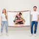 Design av en ballerina på knä under sin repetition. Bilden är skapad med gula och rosa färgmoln i bakgrunden som smälter in i ballerinans figur.