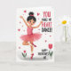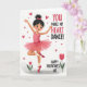 This greeting card shows a smiling young ballerina dancing on one leg in the center. She has dark hair in a top bun with a pink bow, and her face looks bright and happy. She wears a pink leotard with a light, see-through tutu, and her arms are held out with open hands like she’s sharing a hug. Cream-colored socks and reddish-pink ballet slippers finish her outfit, and small red hearts are scattered around the white background. In the upper right, the card says “YOU MAKE MY HEART DANCE!” in big block letters, with words alternating between pink and black. At the bottom, two pink tulips with green stems sit near the message “HAPPY VALENTINE’S DAY,” placed close to one of the flowers. It feels sweet and caring, perfect for sending a little romance or friendship ❤️