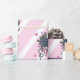 Söt balletskor för din lilla ballerina accentuerad med blommor och pärlor. En rosa- och vit rand-bakgrund slutför sensembeln.