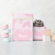 Lastpallskläder med namn inslagna papper, ljus rosa bakgrund. Anpassa figursättningen pappert med speciell namn eller text, färg med bakgrunden bland andra alternativ.