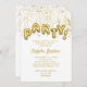 Gör dig redo att festa! Vår chiska födelsedagsinbjudan innehåller "PARTY!" i cool gold-foil ballongtext, omgiven av guldkonetti. Din partiinformation är elegant skriven i guld på en skarp vit bakgrund. Baksidan av inbjudan är vit och innehåller ytterligare konfiguration. Gå med i firandet!