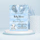 För en babydusch, fira en pojke. En blå, fingerad, metallisk tittar bakgrund. Dekorerad med blå faux glitter-droppar, målardroppstift, ballonger och en söt liten liten elefantpojke från baby. Anpassa och lägga till uppgifter om namn i mamma till namn och party. Namn och texten: Baby Shower är skrivet med ett handskript i stil