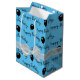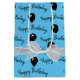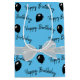 Grattis på födelsedagen med vit skal och svarta ballonger på akvblått underlag. Bakgrund färg och text kan redigeras.