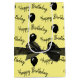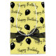 Grattis på födelsedagen text med svart skal och svarta ballonger på gultens bakgrund. Bakgrund färg och text kan redigeras.