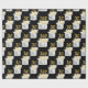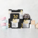 Ballonger guld party, rosett band och mousserande ljusstrålar i en vit låda på svart för 30års födelsedag. Den svarta bakgrunden färg kan ändras.