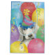 Grattis på födelsedagen hälsning med denna utformning som har en söt, party-hatt-klädd Weimaraner-valp omgiven av färgstarka ballonger, konfekt och strömmare.