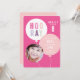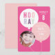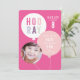 Den här moderna födelsedagsinbjudan till barn har en ballongknippe med rosa, lila och grå HOORAY-text och foto av födelsedagsbarnet. Anpassningsbar text i vitt och födelsedagsdetaljer inuti ballongen gör det roligt, samtidigt som det är modernt och fräscht. Den rosa och lila färgpaletten gör den perfekt för en flickas födelsedagsfest. Kompletterande färg på baksidan. Ytterligare festartiklar, som stämplar, tackkort och festsmycken, finns i samlingen Balloon bunch av Stacey Meacham.