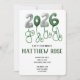 2026 graduation invitation. Classic green and white. Retro balloon letters celebrate the graduate.