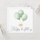 Pretty mint green balloons tied with a golden bow float above an elegant calligraphy 'Happy birthday' script. Embellished with a decorative heart flourish on the letter h and letter p.