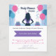 A party planner flyer featuring a silhouette of a woman with long hair and a party hat. She is standing in a room with balloons, twists, cakes and the background is a light blue gradient.