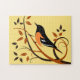 Dekorativ fågelkonst på pussel med Baltimore Oriole sittande på stiliserad gren med bladsmönster i tvåtonsfärg