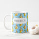 Handlar ni om kaffe? Ett mugg med texten "BANANAS ABOUT COFFEE" över ett livligt mönster av gult med stiliserade pixelbilder på himmel blå bakgrund. Användan "Anpassa den här mallen" om du vill göra enkla textändringar i texten, som en alternativ slogan. Dessa ändringar återspeglas på båda sidor. Användan "Redigera design" om du vill ha mer kontroll över inslag som teckensnitt storlekt, färg och placering. Kom ihåg att göra de här större ändringarna både fram och tillbaka.