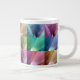 Det ursprungliga mönstret av ZoeSPEAK på denna jätte-mugg gjordes från Zoes ursprungliga fotografier av bananblad på ett träd i trädgården. Fotografierna är närbilder som visar de räfflade mönstren på bladen när de böjs runt varandra i solljuset. Fotografierna har färgats med en mängd olika dämpade färger, klara gröna, blåa, bruna och lila nyanser. Sömmarna där fotografierna möts har lite vågiga kanter, som om de sys ihop som en kväls.