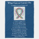Konsten har "Blue, Marigold, and Lila Awareness Ribbon Angel" för att visa stöd för blåscancer. Konsten visar en skyddsängel som håller ett lila-, marigold- och blått medvetandeband och dikt "What Cancer Not Do" snurrar runt den. Dikt säger "Vad cancer inte kan göra, cancer är så begränsadt.." Det kan inte lamslå kärlek. Det kan inte skingra hoppet. Den kan inte bekräfta tron. Det kan inte förstöra freden. Den kan inte döda vänskap. Den kan inte undertrycka minnen. Den kan inte tysta modet. Det kan inte invadera själen. Det kan inte stjäla evigt liv. Den kan inte erövra andan. - Författare okänd" Se till att anpassningsbarna blir medveten om cancer genom filtar för dig själv eller som en gåva till en älskad. Lägg till ditt eget ord eller bilder till den här mjuka filten för speciellt medvetande om cancergåvor.