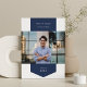 Anpassa det här moderna studenten-meddelandet med ett vågrät- eller landskapsorienterat foto som är överlagt på en banderoll i klassisk marinblått. Lägg till din student namn, skola och studenten år. Anpassa baksidan med ytterligare ett foto och ett personligt meddelande.