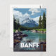 Capture the stunning natural beauty of the Canadian Rockies with this vintage travel-style design featuring Banff National Park. The illustration showcases an iconic, clear turquoise river flowing through a forested valley, framed by majestic pine trees and snow-capped mountains under a bright, cloudy sky. Perfect for anyone who loves nature, hiking, camping, and vintage tourism art. This design makes a wonderful keepsake or gift for visitors and admirers of Alberta, Canada's famous national park.