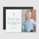 Tack till din familj och dina vänner för att du har gått på pojke första födelsedag och baptism med ett foto av ditt barn. Den blå designen har vit polka dots på en blå vattenfärgsbakgrund på baksidan av kortet. All text kan anpassas, inklusive ditt barns namn och meddelandet.