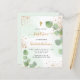 En vit och ljust grönt bakgrund som dekoreras med eukalyptus greenery och faux guld glitter stoft. Personalisera och barn namn och ceremoniuppgifter. Svart och guldfärgad färgad brev. Könsneutralt. Baksida: ljust grönt bakgrund.