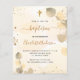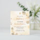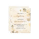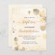 En gyllene vattenfärgad bakgrund som dekoreras med guldeukalyptus och faux guld glitter stoft. Personalisera och barn namn och ceremoniuppgifter. Svart och guldfärgad färgad brev. Könsneutralt. Baksida: guldfärgad bakgrund med vattenfärg